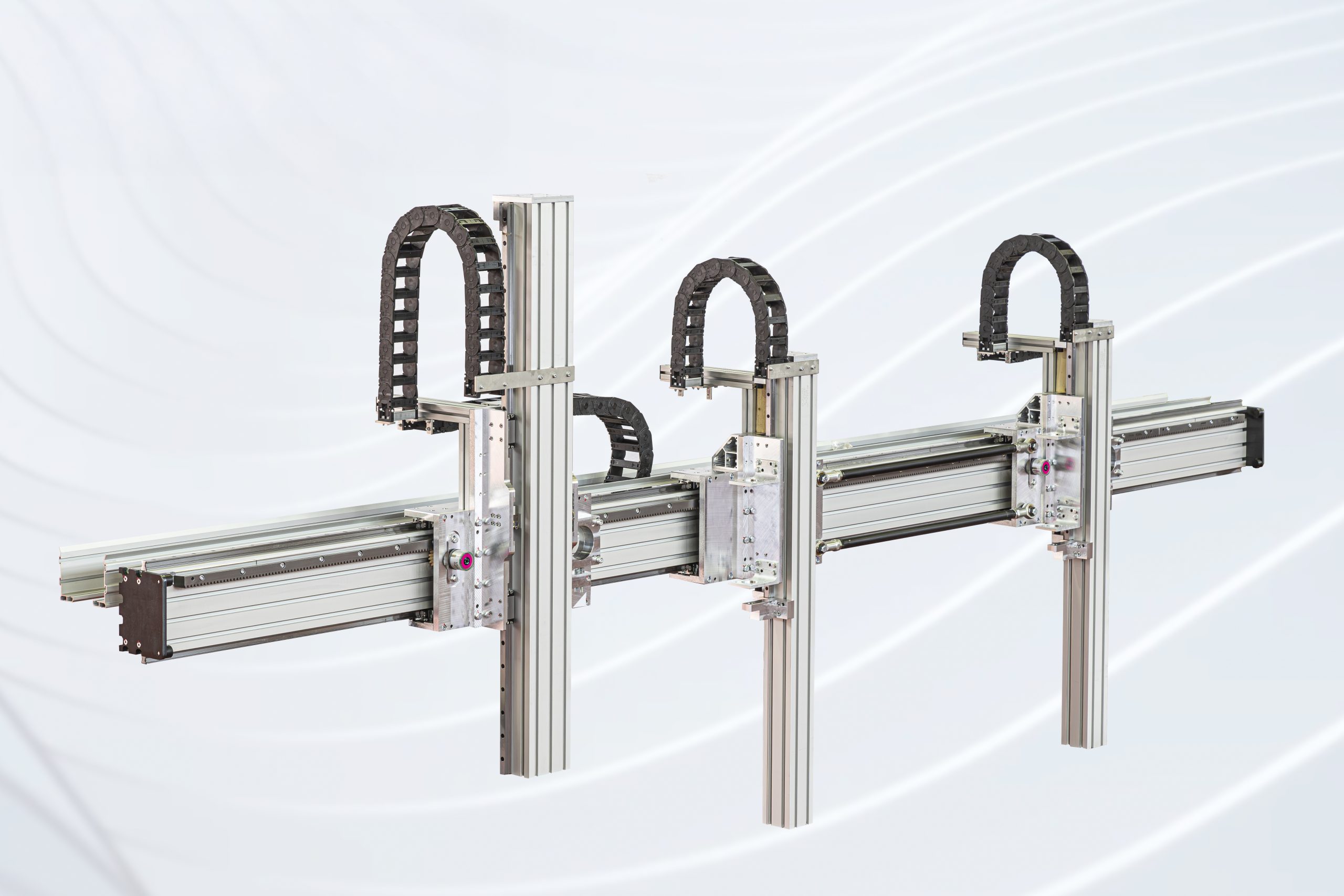 Meccania linear modules, equipped with linear guides and optimized transmission systems, are designed to integrate with the actuation technologies selected by the client or designer — including linear motor modules for rapid or independent movements on multiple carriages.
