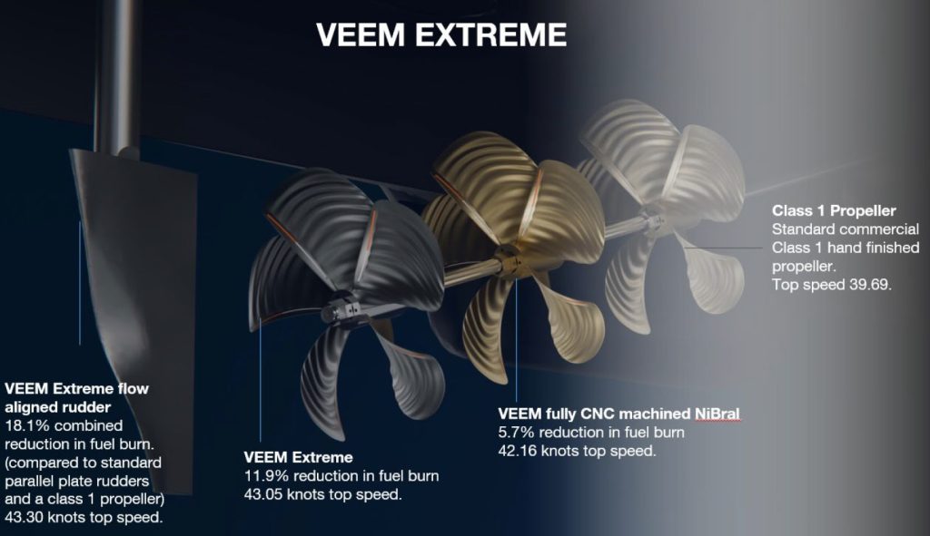 A combined, comprehensive, and custom-engineered system – comprising propeller, shaft, struts, and rudder – delivering an 18.1% REDUCTION in fuel consumption and carbon emissions compared to a traditional system equipped with a Class 1 propeller. All tests were verified by Lloyd’s Register on VEEM’s trial vessel, which also recorded an 8.5% INCREASE in maximum speed.