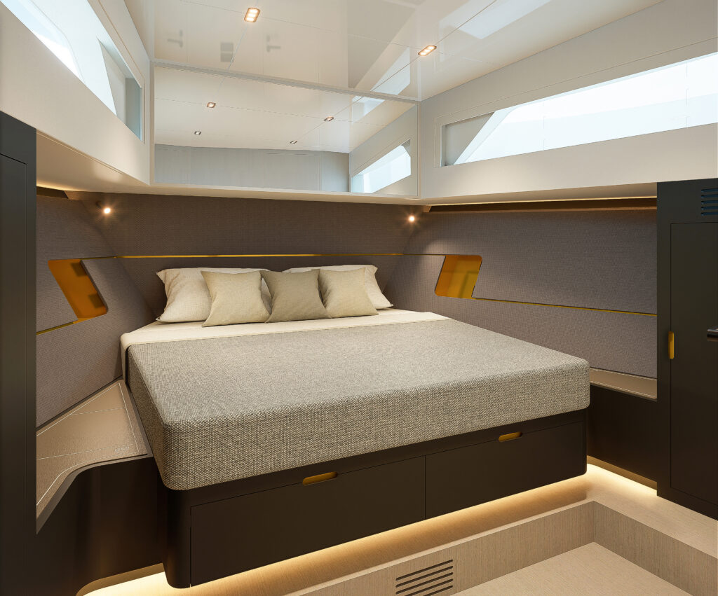 The interiors reflect a sober and welcoming luxury. “We chose warm tones, simple geometries, and clean lines. Wooden floors, glossy and matte lacquers, gold-finish details: luxury here is not ostentation, but a refined atmosphere,” concludes Giordano. “We want those who see it to immediately recognize the Forte Yachts style: generous proportions, livable spaces, and a contemporary approach to the sea.”