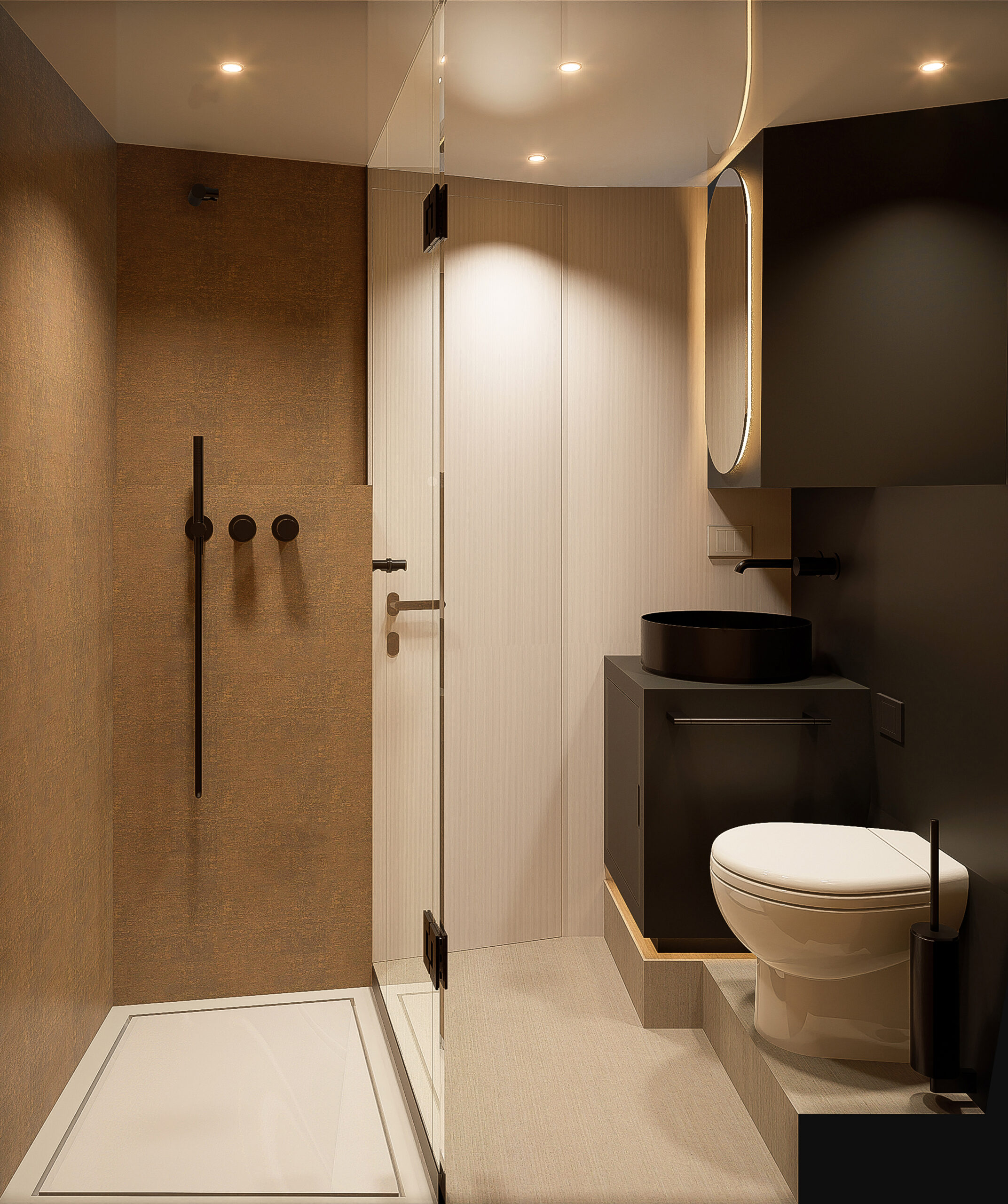 The interiors reflect a sober and welcoming luxury. “We chose warm tones, simple geometries, and clean lines. Wooden floors, glossy and matte lacquers, gold-finish details: luxury here is not ostentation, but a refined atmosphere,” concludes Giordano. “We want those who see it to immediately recognize the Forte Yachts style: generous proportions, livable spaces, and a contemporary approach to the sea.”