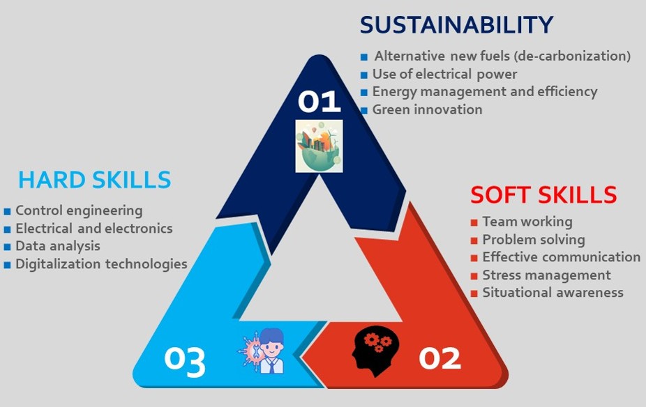 A survey by a professional association identified 10 key skills ranked as priorities by seafarers for their learning (Fig.2) to keep pace with changes in the industry. When designing a training course, these key skills can be mapped onto elements of the triangle diagram model (Fig.3), which serves as a framework to structure and integrate the identified competences.