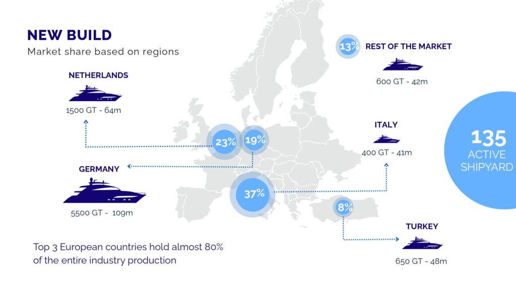 Italy leads with 37% of global production, focusing on yachts 40 m in average; The Netherlands follows with 23%, building yachts slightly larger – around 48 m. Germany, with 19%, specializes in the giants of the sea – vessels often over 100 meters and above 5,000 GT.