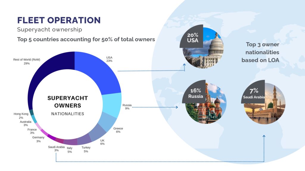 We then move onto the fleet which organically brings the findings about the Superyacht ownership that spans the globe: the data shows clear concentration among a few regions [picture 3]. The United States leads with 23% of all owners, followed by Russia with 9%. When we combine Greece, the UK, Italy, and other European nations, Europe accounts for more than one-third of total ownership.