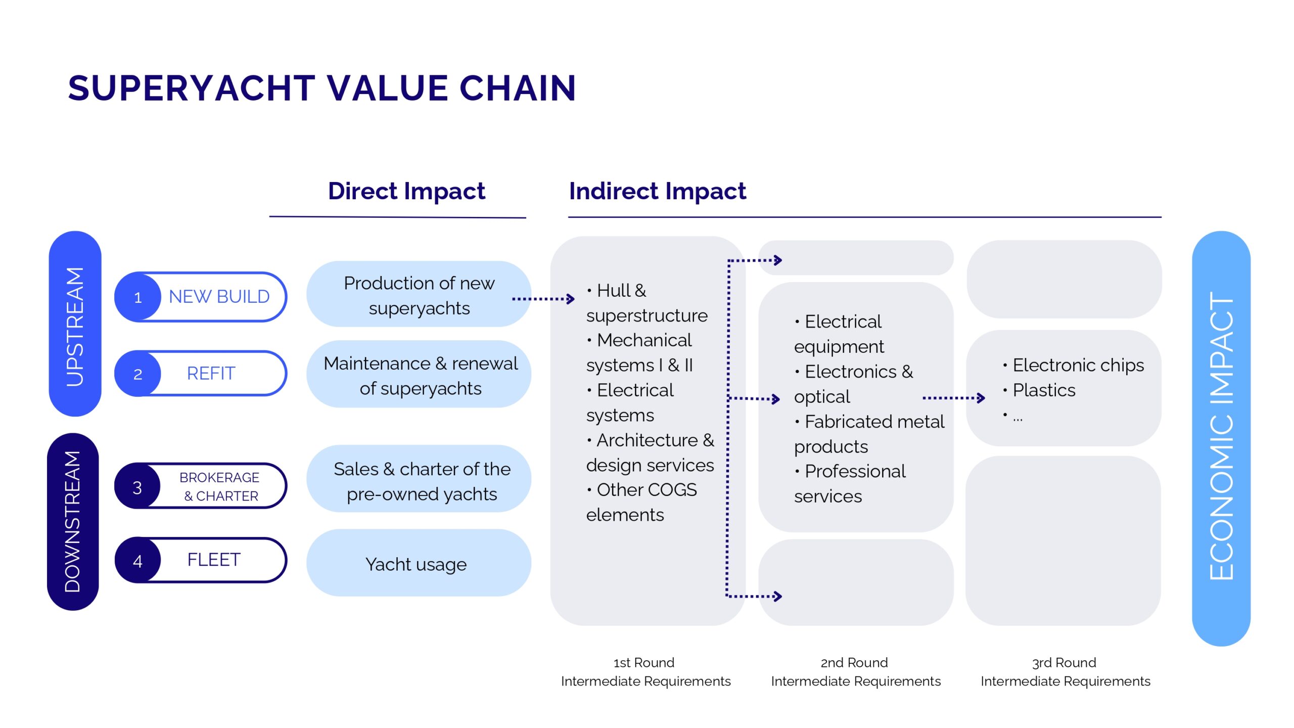 When we look at the superyacht value chain, we divide it into 2 sections: upstream and downstream. In the upstream part, we focus on new build and refit, which cover the production and maintenance side of superyachts. The downstream part looks at the brokerage and charter sectors, as well as the economic impact of fleet usage.