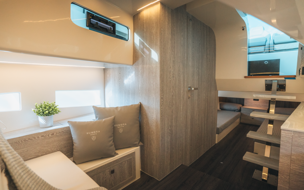 A strong emphasis has been placed on optimising space aboard. Below deck, the Kumbra 34 features two cabins: a bow cabin with a convertible double bed, and a spacious aft cabin with twin beds – providing practical overnight comfort for up to four adults.