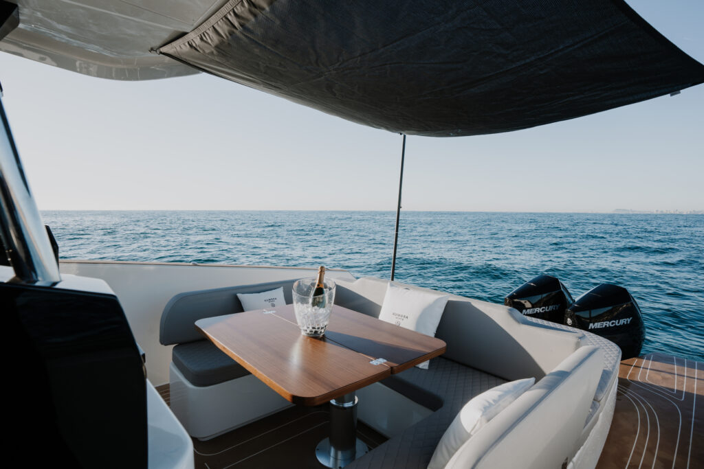 The design of the Kumbra 34 is the result of in-house creativity, led by the boat’s designer Dani Miravalls. Notably, the carpentry is handcrafted by a local artisan using high-quality materials, ensuring a warm, tactile feel throughout the vessel. Víctor Moure worked closely with Miravalls to select materials that strike the right balance between visual impact, durability, and client expectations typical of a modern sport cruiser yacht.