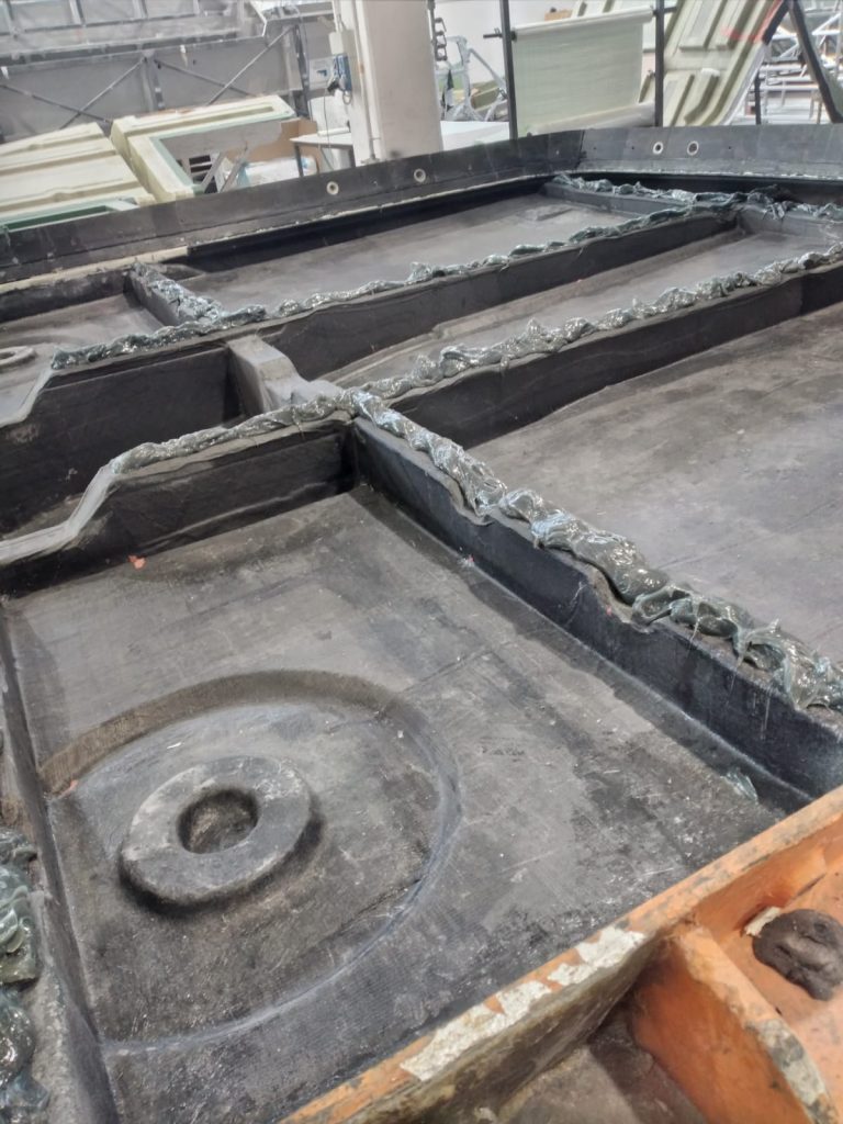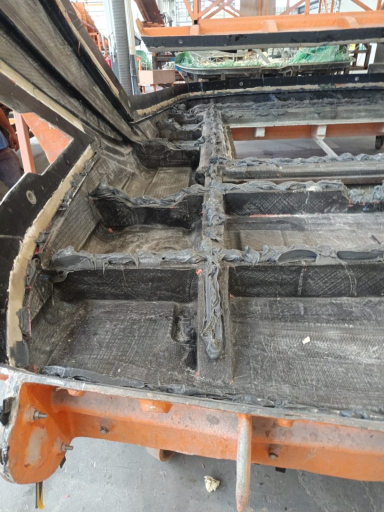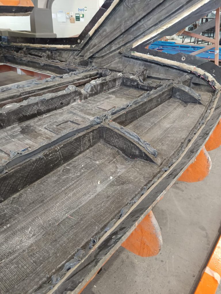 C: Bonding of stringers and crossbeams onto the hull mould.