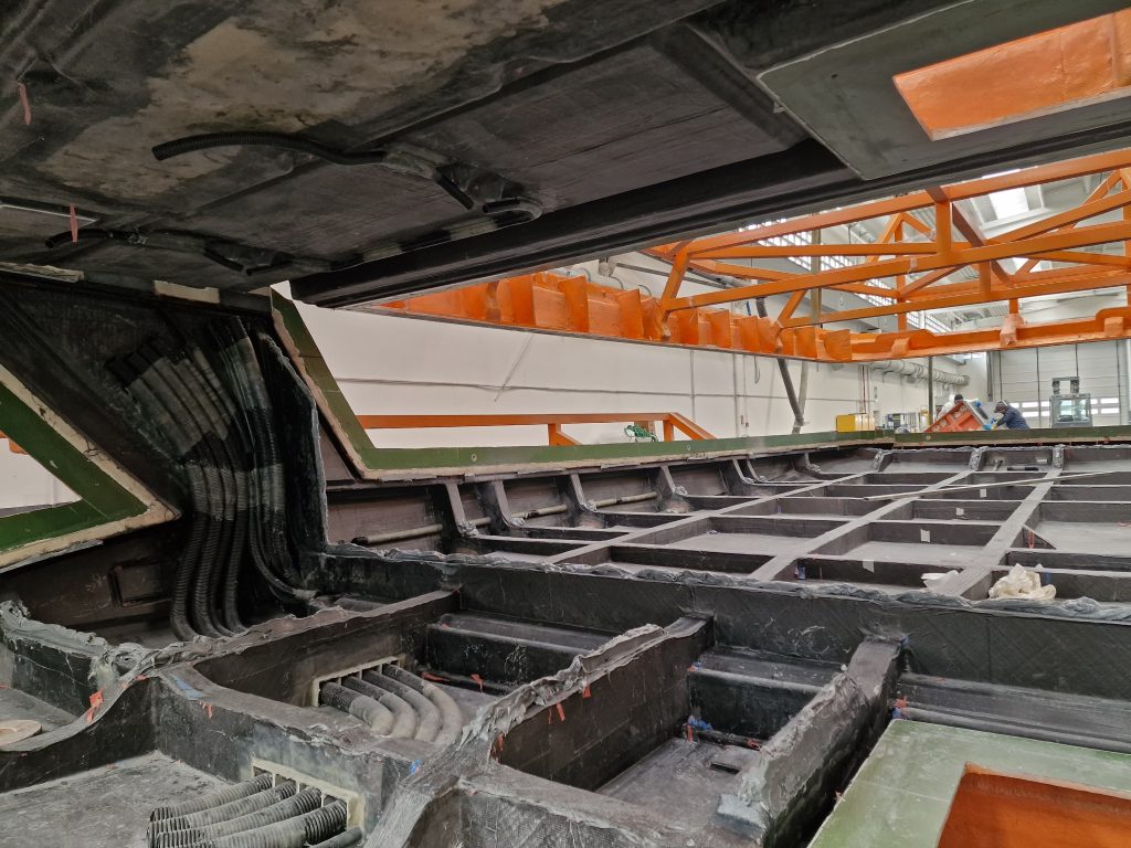 A. Inside of the mould with stiffening structure and integrated cable passage.